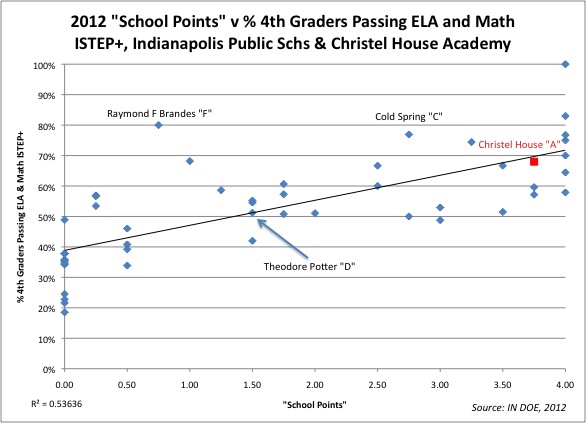 Each data point here is either an IPS school that reported scores for 4th Grade, or Christel House, which is marked in red. The x-axis is the grade the school received from the IN-DOE in "school points"; depending on the cutoff points, the number of school points determines the letter grade for a school. The y-axis shows the percentage of all students at the school who passed both the language arts and math exams in 2012.