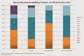 The special education students in Hoboken's charters are far more likely to have lower-cost disabilities -- specific learning disabilities (SLD) and speech disabilities (SPL) -- than the students educated in the district schools. It's much easier, then, for Elysian to integrate their special needs students into general education classes.