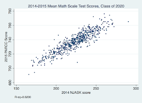 * OK, I need to make this clear: there was an issue with the NJASK having a bit of a ceiling effect. I've always found it kind of funny when people got overly worried about this: like the worst thing for the state was that so many kids were finding the old test so easy, too many were getting perfect scores!